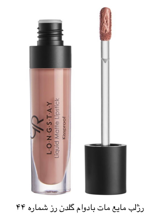 رژلب مایع مات با دوام گلدن رز شماره ۴۴ با حجم ۵.۵ میل ساخت کشور ترکیه است این رژلب دارای پوشاندگی کامل با ماندگاری طولانی، بافت نرم و سبک می باشد. فاقد ترکیبات نگهدارنده پارابن است، جلوه نهایی این رژلب مات و مخملی می باشد.